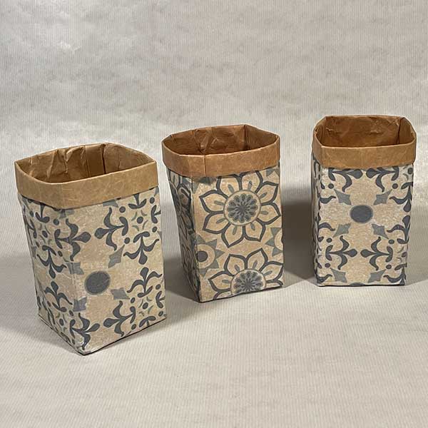 Fertig gestaltete Pocketbags mit dem Motiv „Blue Tiles“